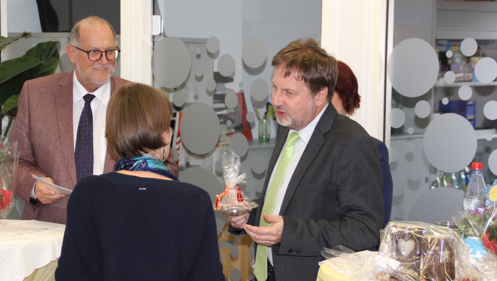 Michael Krumbe, Vorstand des KCA-Jobcenters, und der AQA-Geschäftsführer, Hans-Jürgen Scherer, machten sich am neuen Stützpunkt des Bildungswerks Hausfrauen-Bund in der Hanauer Donaustraße persönlich ein Bild davon, wie abwechslungsreich und vielschichtig das Berufsfeld Hauswirtschaft ist. Wie organisiere ich ein heißes oder kaltes Buffet? Was gilt es zu beachten, wenn ich Kinder oder ältere Menschen betreue? Wie reinige ich Rotweinflecken in einem Tischtuch und welche Putzmittel nutze ich generell für welchen Einsatzzweck? Anhand solcher plakativer Fragen verdeutlichten die Teilnehmerinnen ihren Besuchern die tägliche Berufspraxis. Krumbe und Scherer zeigten sich in der lebhaften Diskussion sehr angetan und konnten augenzwinkernd einige Beispiele aus dem eigenen Privatleben beisteuern. Die Damen berichteten auch von den persönlichen Herausforderungen, fast alle sind Mütter und mussten neben der Qualifizierung noch Haushalt und Familie unter einen Hut bringen. Einige nahmen anderthalb Jahre lang die weite Anfahrt aus dem östlichen Zipfel des Main-Kinzig-Kreises auf sich – immer das große Ziel fest im Blick. „Wir haben großen Respekt, vor dem was Sie geleistet haben und ich habe keine Sorge, dass Sie alle ihren Weg gehen werden“, brachte Scherer seine Freude zum Ausdruck. Dem pflichtete Krumbe bei: „Der Arbeitsmarkt sucht gut ausgebildete Fachkräften wie Sie – Sie können jetzt Ihre Zukunft in die eigene Hand nehmen und sind damit ein Vorbild für andere und nicht zuletzt für Ihre eigenen Kinder.“ Beide Repräsentanten des Main-Kinzig-Kreises beglückwünschten jede Absolventin einzeln mit einem Zertifikat sowie einem handgefertigten Präsent aus den AQA-Werkstätten.