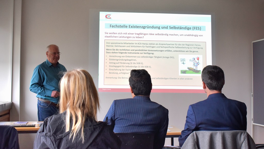 Die junge Frau möchte es ganz genau wissen: Kann sie ihre Erstausstattung an Werkzeug als zukünftige Goldschmiedin über eine einmalige Sonderförderung des Kommunalen Centers für Arbeit (KCA) finanzieren? Geduldig und detailliert beantwortet ihr Volker Adam die Frage. Der Mitarbeiter der Fachstelle Existenzgründung und Selbstständige informiert an diesem Vormittag in Hanau rund zwanzig Menschen. Sie alle beziehen Bürgergeld und sie eint der Wunsch, sich selbstständig zu machen.