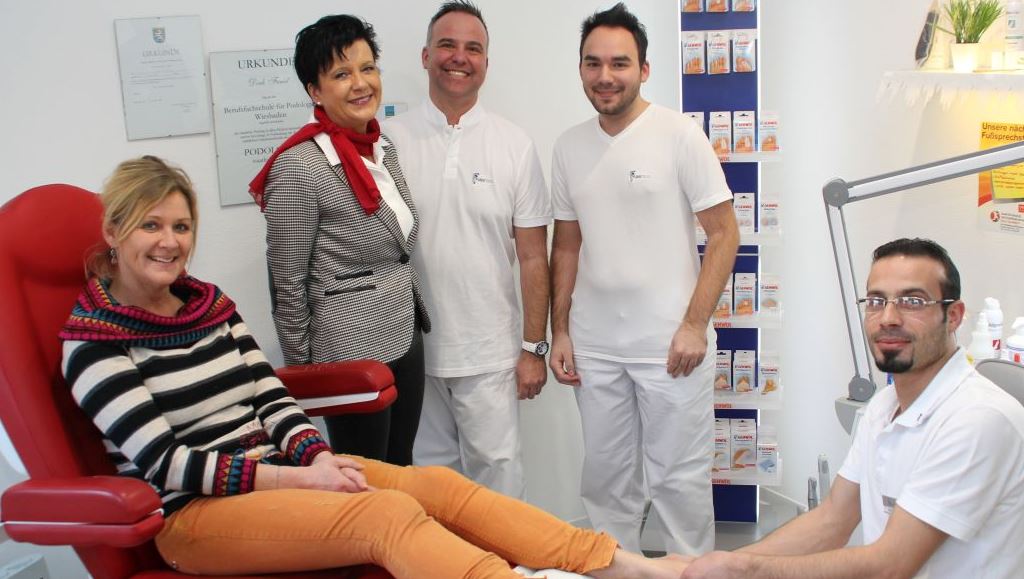 Dirk Fenzl ist kein Mann, dem man leicht etwas ausschlägt. Mit seinem hellen Lachen und seiner freundlichen aber bestimmten Art zerstreut der Fachmann für medizinische Fußpflege rasch die Bedenken seiner Ronneburger Mitbürger. So etwa bei der Frage, ob bei einer Behandlung sein syrischer Schützling zugegen sein darf. Abdul Hoot startete im November 2016 ein Praktikum in dem Traditionsbetrieb für Podologie – der Begriff leitet sich aus dem Altgriechischen ab und bezeichnet die Lehre vom Fuß.Seitdem packt der schüchterne junge Mann – der auf den ersten Blick das komplette Gegenteil seines resoluten Chefs ist – tatkräftig mit an. Ursprünglich stammt Hoot aus Aleppo. Seine zerstörte Heimatstadt ist inzwischen weltweit zum Sinnbild für den grausamen Bürgerkrieg in Syrien geworden. Drei Jahre harrte der gelernte Schneider, der das jüngste von acht Geschwistern ist, dort aus. Dann suchte er sein Heil in der Flucht. Gemeinsam mit einem Freund rettete er sich über die Türkei in den Main-Kinzig-Kreis. Seitdem arbeitet er mit Fleiß und Beharrlichkeit daran, sich hier eine Zukunft aufzubauen. Damit das gelingt, unterstützt ihn neben seiner ehrenamtlichen Integrationslotsin auch Erika Kollmann vom Jobcenter des Kommunalen Centers für Arbeit (KCA). Sie ebnete im Zusammenspiel mit dem Arbeitgeber alle formalen Hürden und kümmerte sich um einen Platz in einem berufsbegleitenden Intensiv-Deutsch-Kurs.