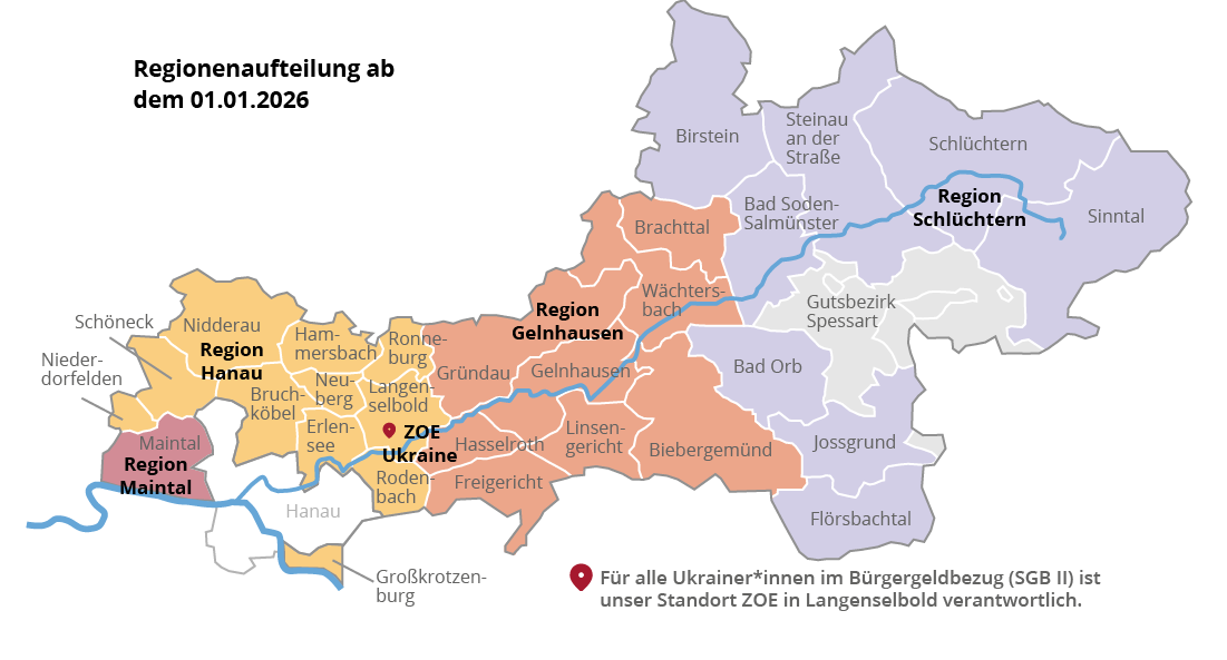 Das Kommunale Center für Arbeit, Region Gelnhausen ist für hilfebedürftige Bürger*innen von Biebergemünd, Brachttal, Freigericht, Gelnhausen, Gründau, Hasselroth, Linsengericht und Wächtersbach zuständig. Die Zuständigkeit für die Kommunen Bad Orb, Birstein, Flörsbachtal und Jossgrund übernimmt aufgrund einer internen Umstrukturierung ab dem 01.01.2026 die Region Schlüchtern.