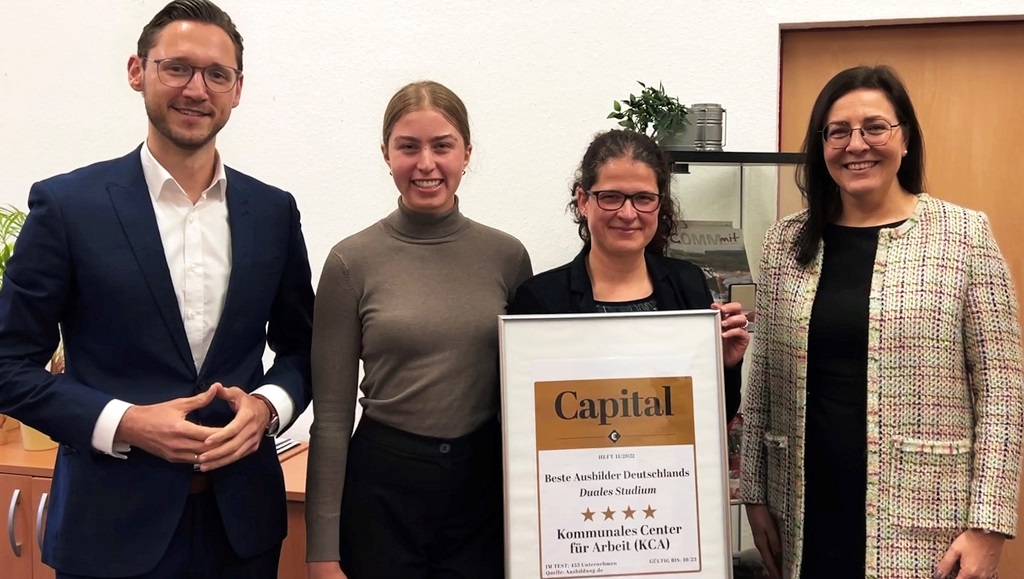 Das Wirtschaftsmagazin Capital ist eine bundesweit respektierte Instanz, wenn es darum geht, die Attraktivität von Arbeitgebern und Ausbildungsbetrieben zu analysieren und zu bewerten. 2022 zeichnet die Zeitschrift erstmals das Kommunale Center für Arbeit (KCA) in der Kategorie „Duales Studium“ aus. Beate Langhammer, Vorstandsvorsitzende des KCA, freut sich über dieses Ergebnis: „Wir haben bereits vor Jahren erkannt, wie wichtig es ist, in unsere Nachwuchskräfte zu investieren. Wir haben günstige und wettbewerbsfähige Rahmenbedingungen geschaffen und vor allem ein Klima, in dem sich junge Menschen wohlfühlen und ihr Potential entfalten. Inzwischen erfüllen die Studierenden diesen positiven Geist selbst mit Leben.“ Die externe Auszeichnung sei daher eine schöne Belohnung für die Arbeit der letzten Jahre, so Langhammer weiter. „Der Dank gilt insbesondere unserem eigenen Personalbereich, aber auch allen ausbildenden Mitarbeitenden, die die Praxisstationen gestalten, Bachelor-Arbeiten begleiten und den Nachwuchskräften im Alltag mit Rat und Tat zur Seite stehen.“