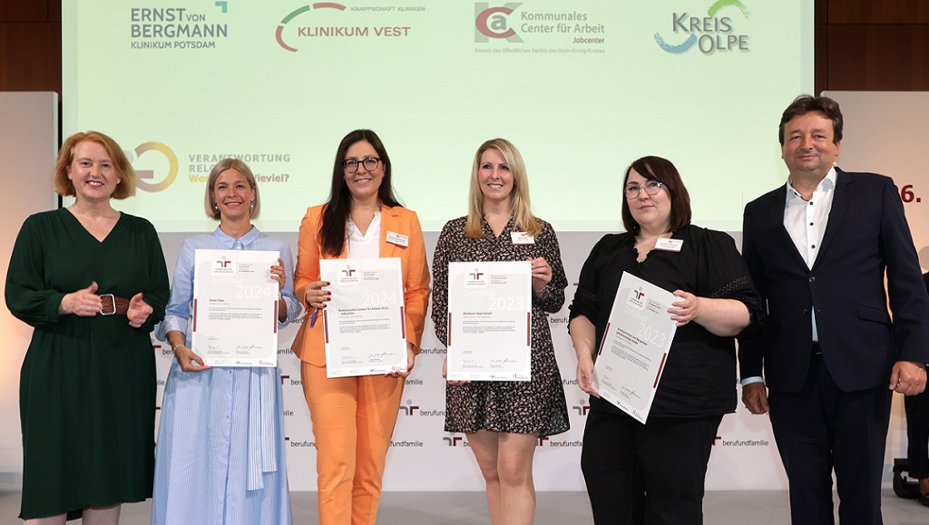 „Egal, ob in der freien Wirtschaft oder in der Verwaltung – diese Rahmenbedingungen gelten mittlerweile überall“, weiß Beate Langhammer, Vorstandsvorsitzende des Kommunalen Centers für Arbeit (KCA). „An allen Ecken und Enden fehlen heute motivierte und gut ausgebildete Fachkräfte, da darf die Familie nicht zum Karriere-Hemmnis werden.“ Diese Einsicht sei bereits seit vielen Jahren fester Bestandteil der Unternehmensphilosophie des KCA, so Langhammer. Daher habe man sich nun entschieden, sich einer umfangreichen Auditierung durch die berufundfamilie Service GmbH zu unterziehen. „Diese Institution ist seit über 25 Jahren in Deutschland aktiv und hat seitdem fast 2.000 Arbeitgeber auditiert“, erläutert die KCA-Vorstandsvorsitzende. Nach einem mehrmonatigen, intensiven Prozess konnte das KCA im Juni 2024 die Zertifizierung in Berlin aus den Händen von Bundesfamilienministerin Lisa Paus entgegennehmen – gemeinsam mit dem Main-Kinzig-Kreis.
