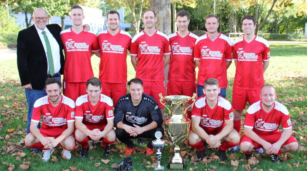 Der dritte Turniersieg beim dritten Auftritt war vor allem einer überragenden Mannschaftsleistung zu verdanken. Die Fußballer des KCA-Jobcenters setzten sich beim Schelmenmarktturnier 2019 erneut in einem anspruchsvollen Feld durch und freuen sich nun darüber, den Wanderpokal behalten zu dürfen. Bei dieser Erfolgsbilanz war Michael Krumbe, Vorstand des KCA-Jobcenters, auch gerne bereit, sich an den Anschaffungskosten für den neuen Wanderpokal zu beteiligen. „Unsere Jungs haben das heute Klasse gemacht. Sie haben sich als Einheit auf wechselnde Herausforderungen eingestellt und diese gemeinschaftlich gemeistert“, so Krumbe, der darin Parallelen zur anspruchsvollen Aufgabe seiner Mitarbeiterinnen und Mitarbeiter im Kommunalen Jobcenter des Main-Kinzig-Kreises sieht. Auch dort stünde Teamgeist im Zentrum, die Bereitschaft für einander einzutreten und die Erkenntnis dass man am Ende immer nur als Mannschaft erfolgreich sein könne. „Fußball ist für uns nicht nur die schönste Nebensache der Welt. Unsere feuerrote Truppe fügt sich nahtlos in das Betriebliches Gesundheitsmanagement im KCA ein“, führt Krumbe fort. Dieses beinhalte zahlreiche Angebote zu Bewegung, gesunder Ernährung und Gesunderhaltung und werde seit Jahren von den Kolleginnen und Kollegen enthusiastisch in Anspruch genommen. Für das Schelmenmarktturnier 2020 räumt Krumbe ein: „Aus der Favoritenrolle werden wir so schnell nicht herauskommen.“