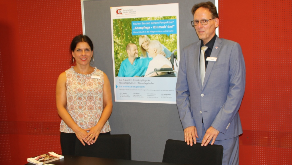 „Pflege bleibt für uns ein sehr präsentes Thema“, so Michael Krumbe, Vorstand des KCA-Jobcenters. Zum einen gehe es weiterhin darum, möglichst viele Menschen, die Leistungen nach dem Sozialgesetzbuch II (SGB II) beziehen, für das Berufsfeld auszubilden. Zum anderen sei man als großer Arbeitgeber mit 400 Mitarbeiterinnen und Mitarbeitern selbst zunehmend mit Fällen konfrontiert, bei denen es gelte häusliche Pflege von Angehörigen mit beruflichen Anforderungen in Einklang zu bringen. Daher bot es sich an, dass das KCA-Jobcenter eine aktive Rolle auf dem ersten Fachtag Vereinbarkeit Pflege und Beruf wahrnahm. Dieser fand unter Schirmherrschaft von Sozialdezernentin Susanne Simmler Ende Juni 2019 im Main-Kinzig-Forum statt. Ein Fachvortrag räumte mit dem Vorurteil auf, Pflege sei ein weibliches Phänomen. So seien auch stets mehr männliche Beschäftigte von Pflege-Szenarien in der Familie betroffen. Insgesamt verfolgten die Veranstalter das Ziel, mehr Aufmerksamkeit für den Komplex Pflege in allen Facetten zu erzeugen. Fachleute des KCA-Jobcenters brachten sich aktiv in die Debatte mit ein und suchten mittels eines eigenen Standes den Austausch mit interessierten Bürgerinnen und Bürgern. „Die erste Resonanz war sehr positiv, das hohe öffentliche Gewicht dieses Fachtages zeigt, dass wir thematisch am Puls der Zeit sind“ resümiert Krumbe, der weiterhin den Fokus darauf legen wird, sowohl Arbeitsuchende in Pflegeberufe zu qualifizieren, als auch pflegenden Mitarbeitenden entgegen zu kommen.