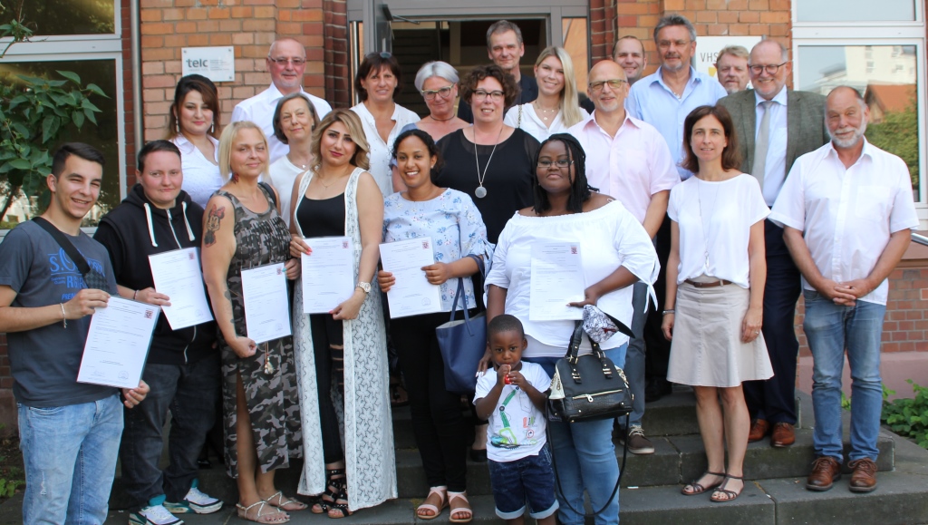 Als Susanne Simmler und Axel Weiss-Thiel im Oktober 2018 gemeinsam den Hauptschul-Kurs bei der Volkshochschule (VHS) in Hanau besuchten, verabredeten sie sich spontan, zur Zeugnisübergabe wieder in das Lamboy zu kommen. Um dieses Versprechen einzulösen, trafen sich die Erste Kreisbeigeordnete des Main-Kinzig-Kreises und der Bürgermeister der Stadt Hanau am 25. Juni 2019. Ihr gemeinsames Anliegen: Den insgesamt neun erfolgreichen Absolventinnen und Absolventen – viele mit Flucht- oder Migrationshintergrund – ihre Wertschätzung ausdrücken. Alle Kursteilnehmer eint, dass sie Leistungen nach dem Sozialgesetzbuch II (SGB II) beziehen. Das für diese Menschen verantwortliche Jobcenter des Kommunalen Centers für Arbeit (KCA) hatte im Frühjahr 2018 den Bedarf nach einem Hauptschulabschlusskurs in Teilzeit mit einer durchgängigen sozialpädagogischen Betreuung erkannt. Impulsgeber war hier unter anderem das KCA-Projekt „Früh in Arbeit“ für Eltern im SGB-II-Leistungsbezug, welches aus Mitteln das Landes Hessen gefördert wird. Als renommierter Bildungsträger war die VHS der ideale Partner für das Vorhaben. Diese hatte ihr bereits zertifiziertes Kursangebot an die Bedürfnisse der Zielgruppe angepasst. Der Kurs startete dann ab August 2018 in Teilzeit mit je drei Stunden am Tag über zehn Monate hinweg.